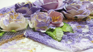 Вязаное ленточное кружево из 100% хлопка заменило фоновые кусочки органзы. были использованы спреи от скрап-эго для окраски кружева и цветов, акриловые краски белого и золотого цветов. в целом в новом альбоме более однородным стал цвет декора. так же в новом альбоме есть узор "дамаск" из текстурной пасты, золотой микробисер создает акценты в складках и подчеркивает объем декора. Декор по-ближе.